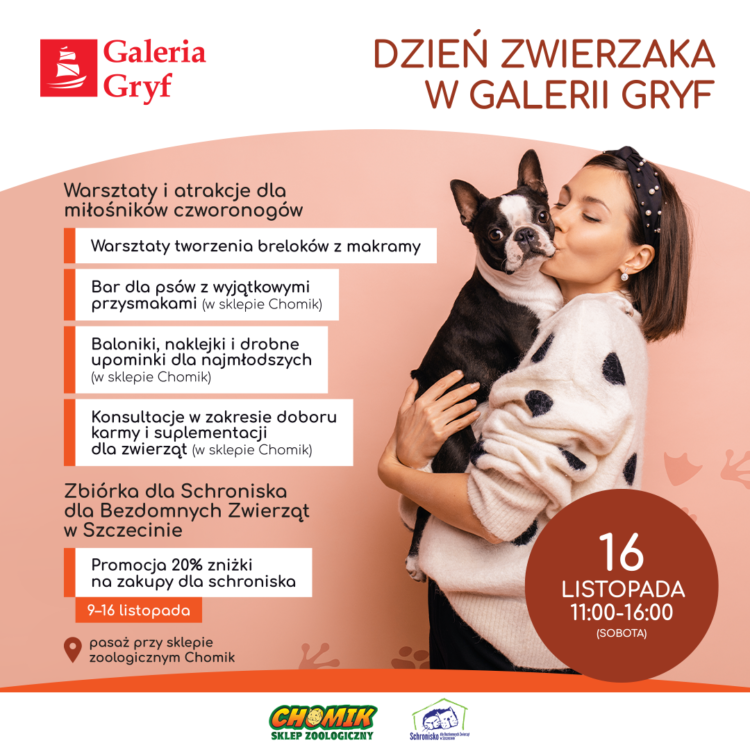 Od 9 do 16 listopada Galeria Gryf prowadzi zbiórkę darów dla szczecińskiego schroniska dla bezdomnych zwierząt. W sobotę, 16 listopada w sklepie zoologicznym Chomik dostępne będą dodatkowe atrakcje dla właścicieli czworonogów i ich pupili, a w pasażu centrum będzie można wziąć udział w bezpłatnych warsztatach tworzenia breloków z makramy.